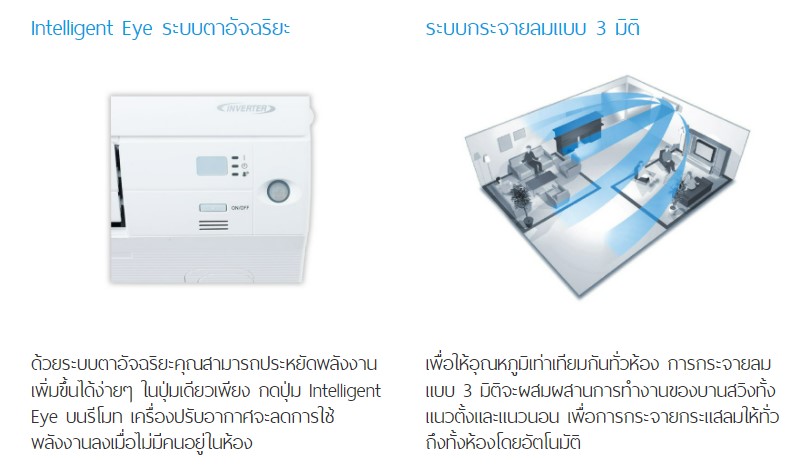 ด้วยระบบตาอัจฉริยะ คุณสามารถประหยัดพลังงานเพิ่มขึ้นได้ง่ายๆ ในปุ่เดียว เพียงกดปุ่ม Intelligent Eye บนรีโมท เครื่องปรับอากาศจะลดการใช้พลังงานเมื่อไม่มีคนอยู่ในห้อง